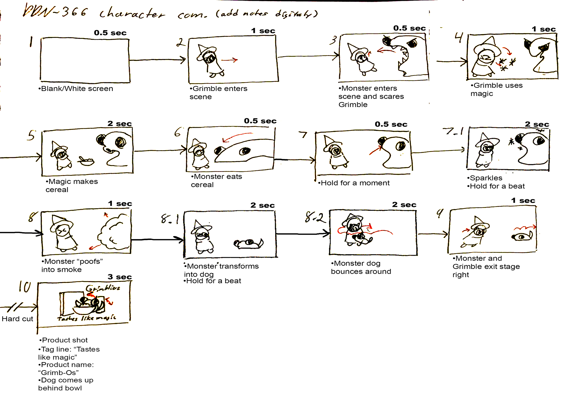 Once the brand had a logo, work on the commercial could begin. As stated, this project takes inspiration from the way Red Bull commercials play out; setup, conflict, resolution/punch-line, to product placement. Unlike Red Bull, the target audience is children, so the conflict is a silly slime monster who is magically transformed into a slime dog with the magic cereal Grimblos.