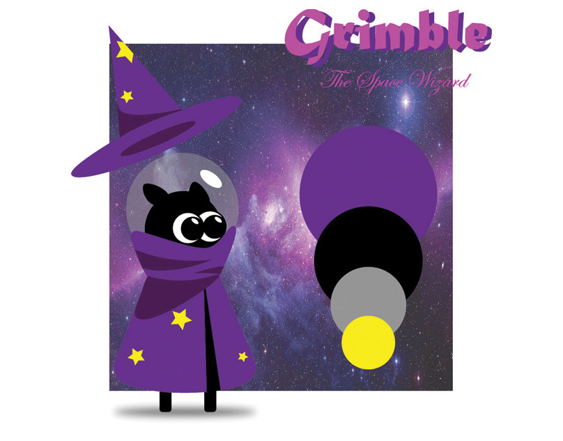 I knew that I wanted to go with the space theme. I then began to design some simple characters that leaned into the primitive shapes. After a few minutes of doodling, I designed Grimble the Space Wizard.