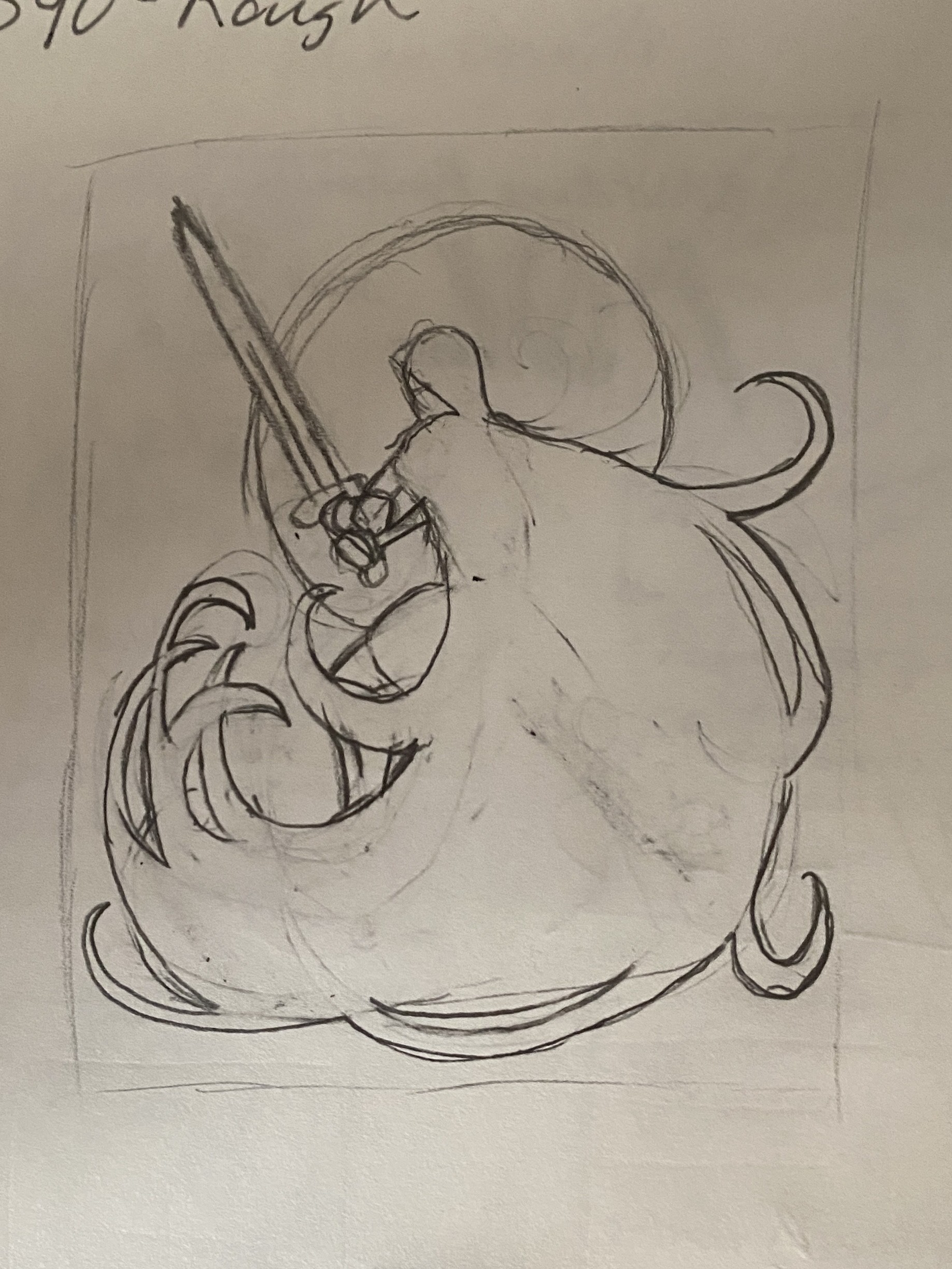 After selecting what I thought to be the most striking of the thumbnails, I created a rough sketch and imported it into Krita, where I digitally painted the character and scene.