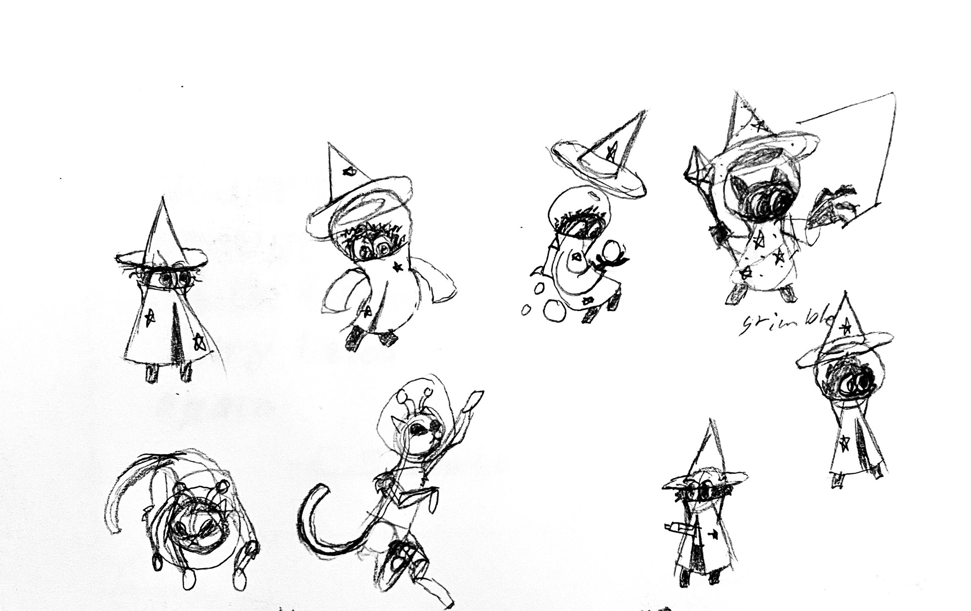 I knew that I wanted to go with the space theme. I then began to design some simple characters that leaned into the primitive shapes. After a few minutes of doodling, I designed Grimble the Space Wizard.