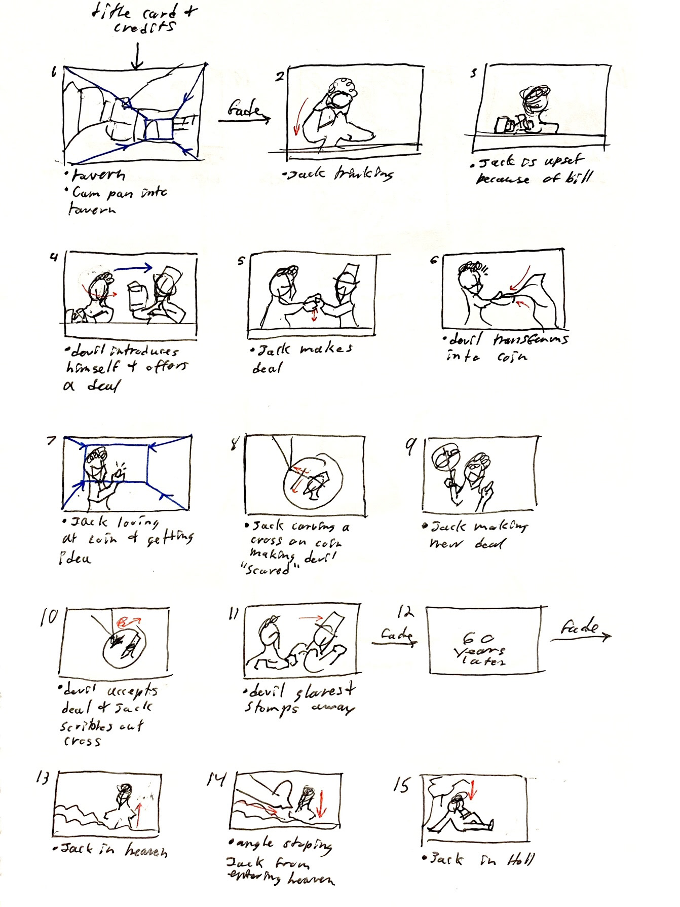 The process of making this short film was to begin with character sketches of the main characters. The original story calls Stingy Jack. So, I wanted to dress him in plain, cheap clothes. Also in the original story, the Devil is portrayed as a dealmaker. So, I dressed him as a 19th century businessman.