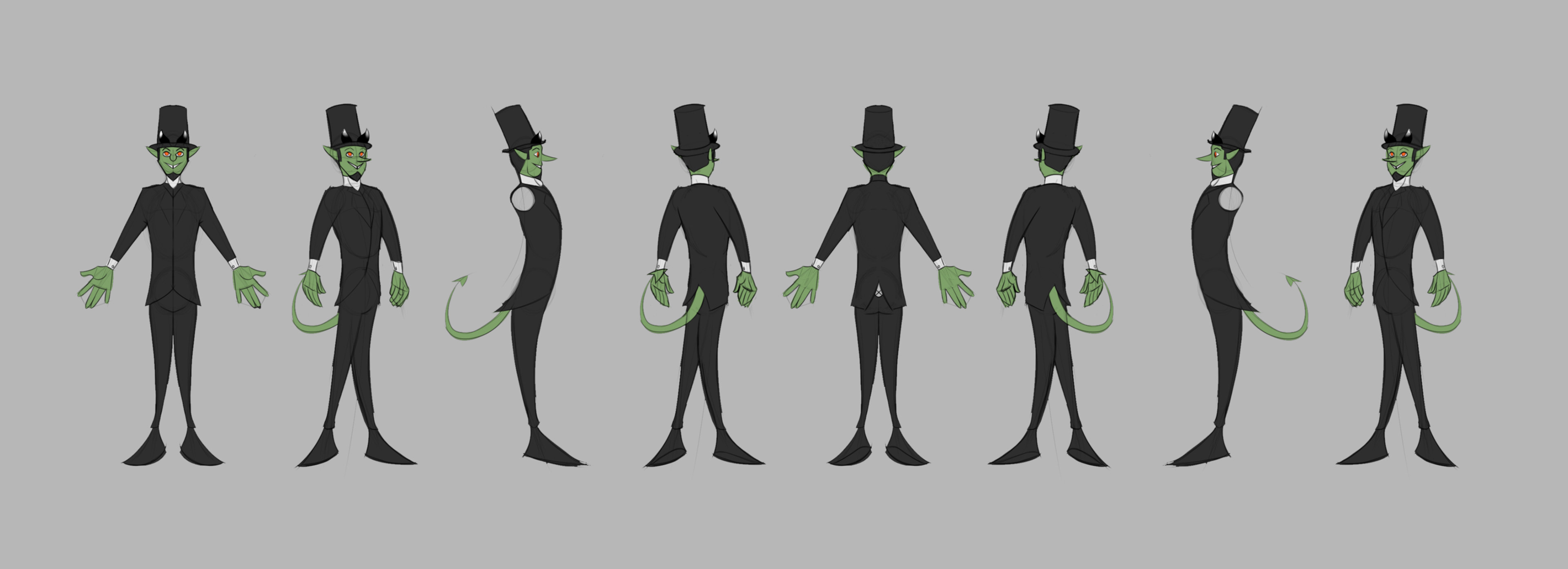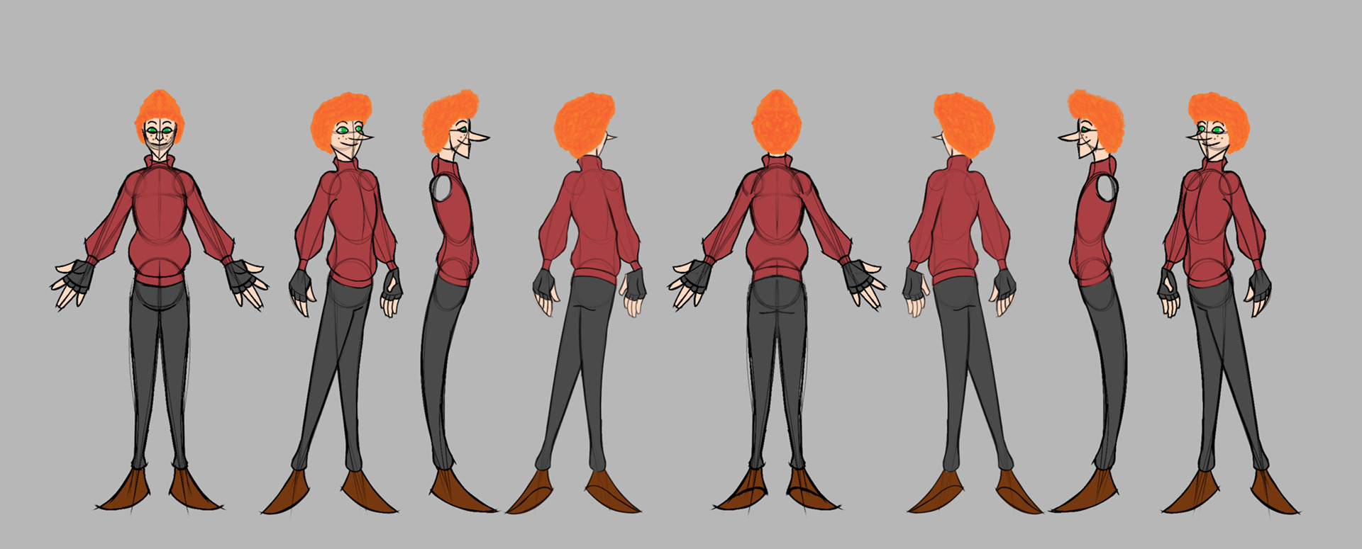 The next step of the process was to finalize the character designs and create a reference sheet in the form of a turn around. This gives the animator the colors and a 360 perspective of what the characters should look like from any angle.